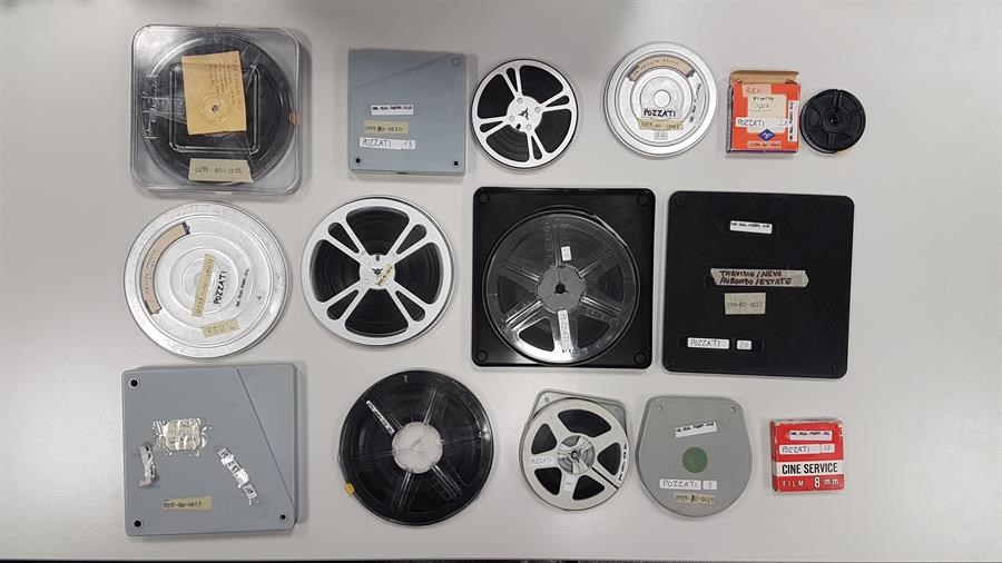 Consistenza/composizione:Il fondo è composto da 22 bobine 8 mm e Super8; da una giuntatrice a nastro Ferrania Super8 Mod. Special; da un cavetto per microfono; da un proiettore Eumig Mark – 501 (8mm e Super8)
