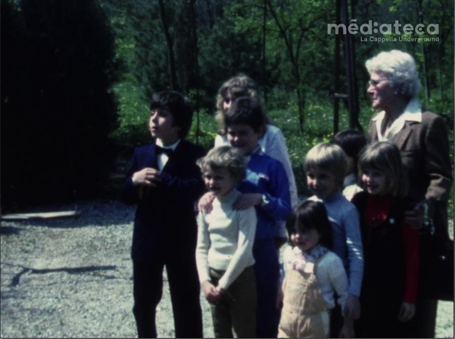 Indicazioni sul soggetto:Cresima di Massimiliano Speranza, cugino di Fabrizio. Momento delle foto e dei giochi tra i figli di Eliseo, Fabrizio, Tiziana, Pierpaolo e Donatella, e i cugini Massimiliano e Marco nel giardino del ristorante; si vede anche nonna Rosina (mamma di Eliseo).