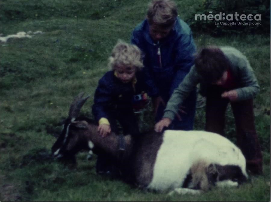 Indicazioni sul soggetto:Gita in montagna, probabilmente in Carnia; Fabrizio, Pierpaolo e Tiziana accarezzano una capra. Festa di compleanno di Tiziana e Donatella, entrambe nate ad Agosto, nella casa di via Romagna con amici di famiglia e parenti (tra questi nonna Rosina). Immagini sottoesposte non riconoscibili.