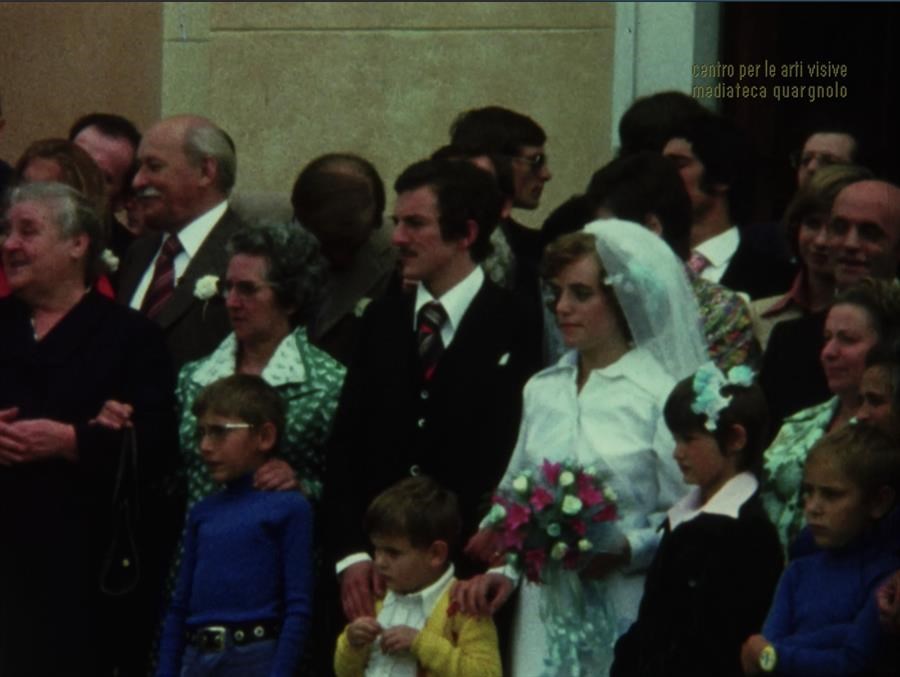Indicazioni sul soggetto:Matrimonio di Gilberto Tuzzi e Marisa Collini; si vede l'arrivo di Marisa, la cerimonia nella chiesa di Montenars (Udine) e l'uscita dalla chiesa degli sposi; tra gli invitati si riconoscono la figlia di Giancarlo Guerra Renata, la suocera Maria e la consuocera Bianca, gli amici di Gilberto, Sandro Boezio, l'autista storico di Gemona Roncastri, la moglie di Giancarlo Guerra, la zia Mariucci, la zia della nonna, il titolare del bar Centrale a Gemona Enzo, il marito della zia